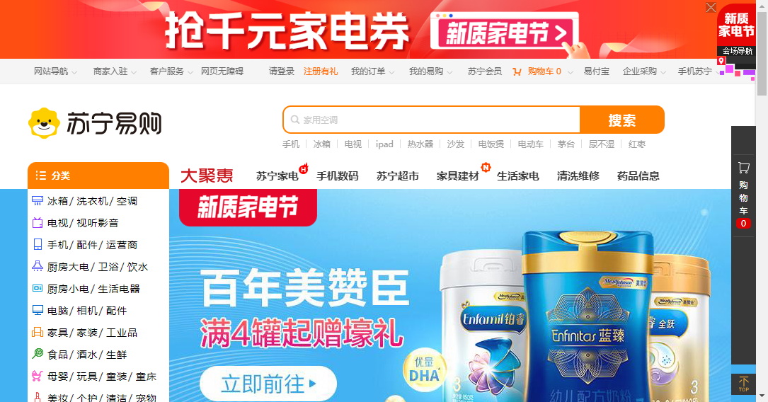 苏宁易购是苏宁电器旗下的B2C综合网上购物平台,该平台现已覆盖传统家电、3C电器、日用百货等众多品类。