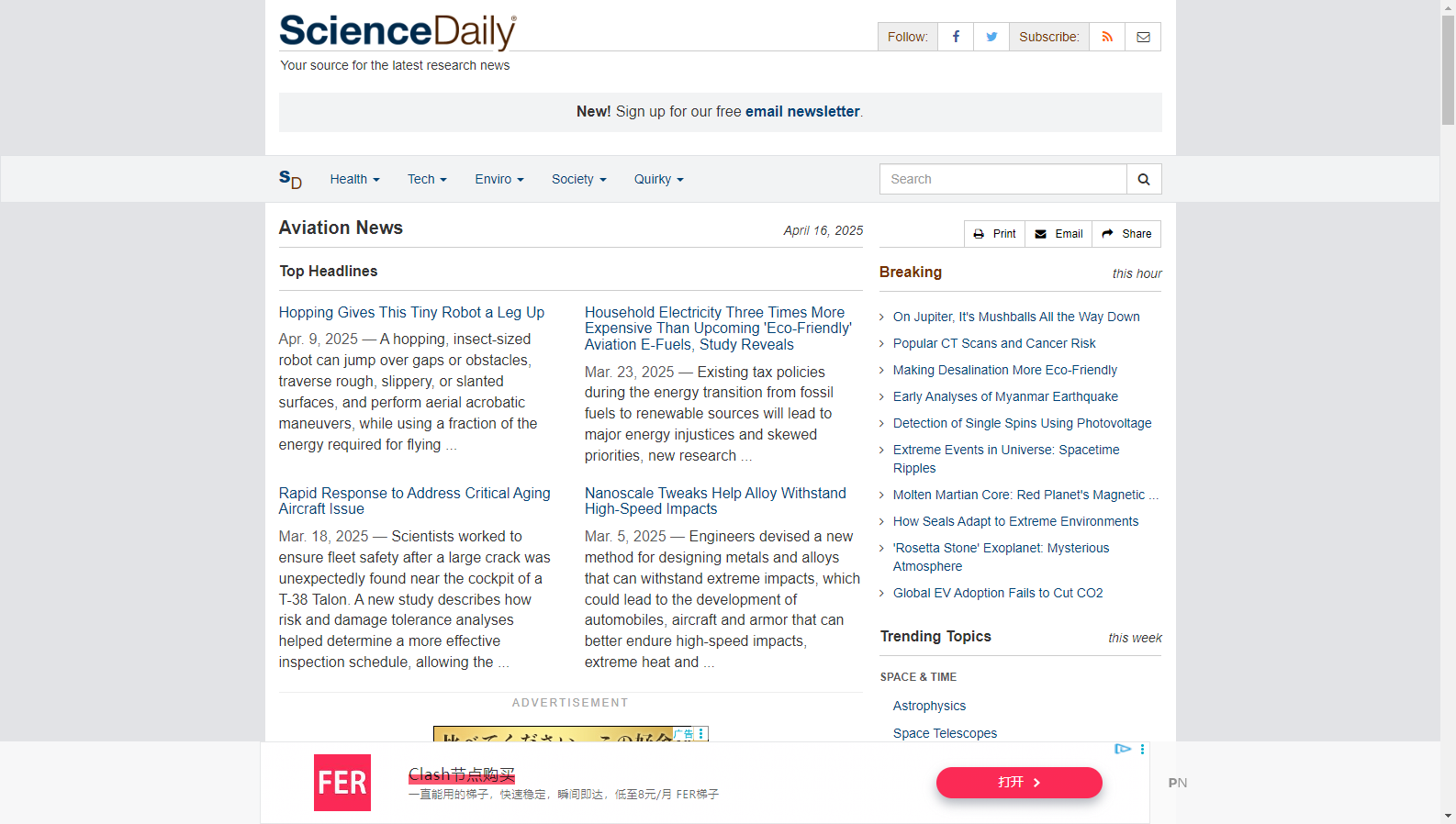 ScienceDaily航空新闻板块是一个专门发布全球航空航天与能源材料领域最新、最前沿科学研究突破的权威信息源。